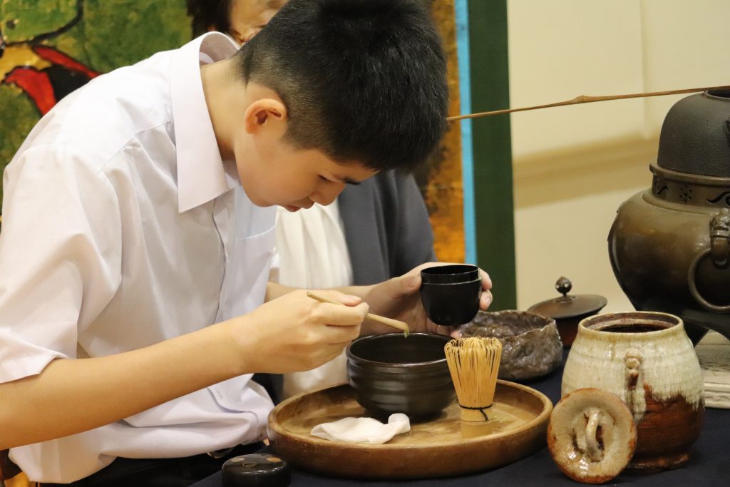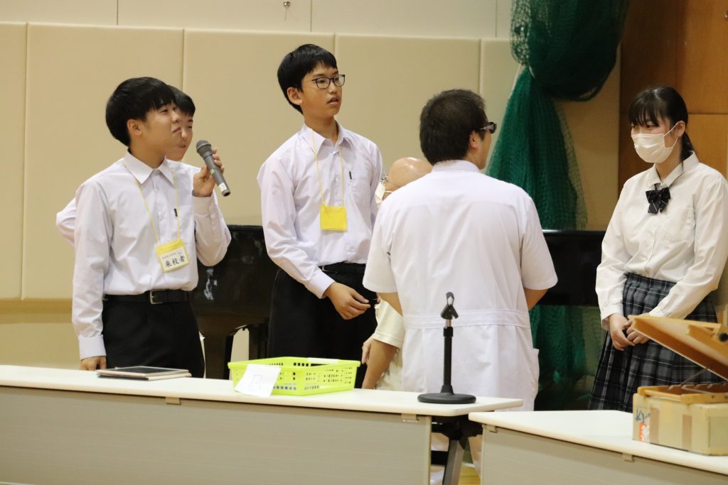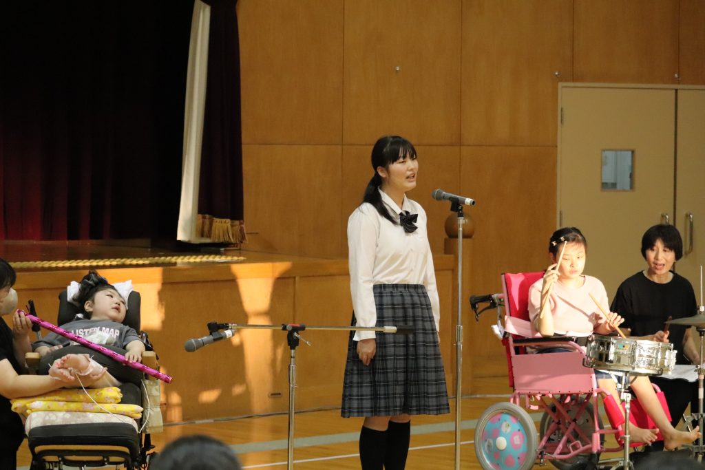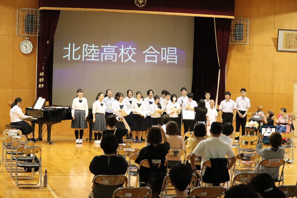 今年度、初めて北陸高校合唱同好会を招いての発表を聴きました。後半は本校生徒全員との合同合唱も行われました。曲目は「見上げてごらん夜の星を」。来賓、保護者、教職員とともに口ずさみながら大人数での合唱を経験することができました。本校生徒の感想では、「とても思い出に残っている」「綺麗なハーモニーが体育館中に広がり、それを生で聞けたことが1番感動した」「合同合唱は達成感があった」「合同合唱は練習で歌った中で一番上手に歌えた気がした」「人数がたくさんいると、こんなにも迫力のある、そして綺麗な響きを出せるということに気づき驚いた」とそれぞれの心に残るものがありました。その他の発表では、高等部3人による朗読劇、小学部・高等部合同の音楽発表、音楽部の歌唱、寄宿舎の活動内容紹介に大きな拍手が送られ、生徒会企画では北陸高校と本校生徒とのチーム戦対決が行われました。休憩時の理療科のクイックマッサージ、茶道部のお点前披露も大盛況でした。
