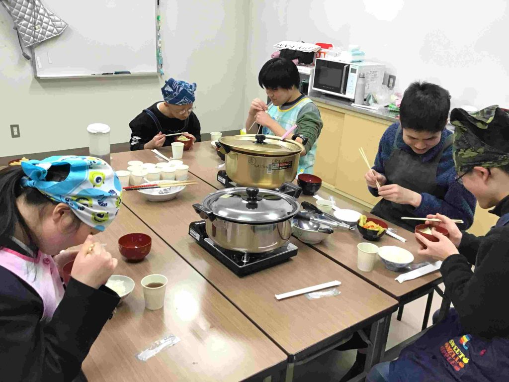 お知らせ 寄宿舎活動紹介 第2回 POP会 2月16日(月)、第2回POP会で鍋パーティーを行いました。今回は、協力して調理する楽しさを知ることを目的として、買い物から調理までのすべてを生徒たちが主体となって取り組みました。 包丁が苦手な生徒たちはデザート作りを担当するなど、互いに協力し合う姿が見られました。 自分たちで進めることで、さまざまな気づきや発見があったようです。 コロナ禍で中止となっていた全員での調理も再開され、楽しいひとときとなりました。
